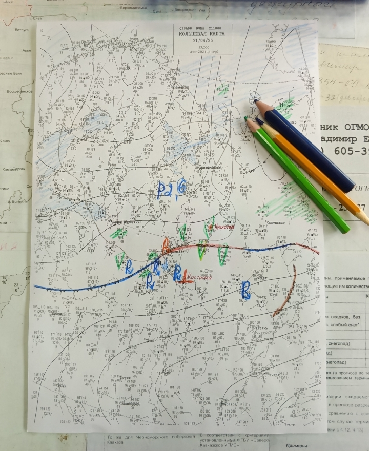21 апреля Костромская область находилась во власти циклона с центром над Псковской областью. Он медленно смещался в восточном направлении. Атмосферный фронт практически в течение суток располагался вдоль северной части области. В большинстве районов наблюдались грозы с 13 часов до конца суток.